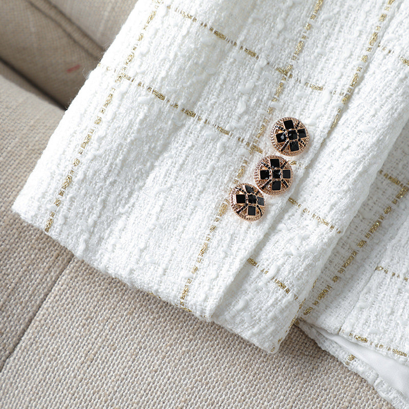 Spun from pure cotton and detailed with a subtle plaid weave, this blazer offers structure without stiffness. Designed for days when you need your outfit to do the talking, it's polished, confident, and just a little unexpected.